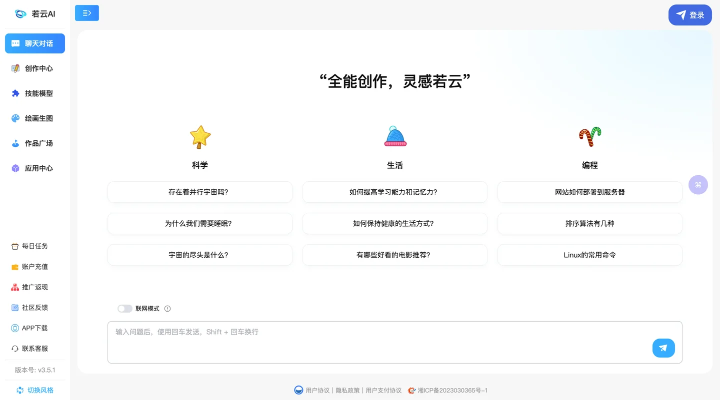 欢迎使用若云AI,一款全能型AI智能创作应用,可以提供智能创作办公和提升办公效率的解决方案。作为一个多功能平台,若云AI还融合了多种主流AI的智能应用,以满足用户的不同需求。 若云AI提供多种AI功能,包括: 1. 智能写作助手:通过我们的语言模型,您可以快速生成高质量的文章、报告或其他书面材料。无论您需要撰写哪种类型的文本,我们都能为您提供帮助。 2. AI绘画:我们的文生图功能可以帮助您将文字描述转换成精美的图像。同时,我们还有图生图功能,可以通过已有的图片生成新的艺术作品。 3. 艺术二维码:若云AI的艺术二维码功能可以将您的文本信息转化为时尚的二维码,让您的二维码与众不同。 4. 思维导图生成:若云AI的思维导图工具可以帮助您创建思维导图,提高您的工作效率和创造力。 5. 其他AI智能应用:我们还整合了许多其他AI智能应用。 我们的平台非常易于使用,您可以随时随地访问。我们相信,无论您是一个专业创作者还是一个普通的办公室工作人员,若云AI都将为您提供强大的支持,帮助您实现更高的效率和创新。 现在就开始探索若云AI吧,我们将一直在这里为您提供帮助。
